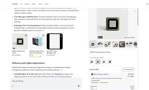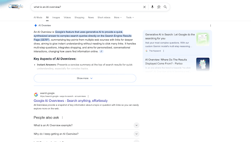 By now you’re familiar with the AI overview and how it’s altered the appearance of search engine results pages. In the pre-AI overview era, we typically saw either shopping listings or search ad listings at the top, followed by organic search results - now we may see an AI overview at the very top, followed by shopping listings or search listings - depending on the query. If we switch to AI mode we might find shopping listings in the AI Mode result if there is commercial intent in the query.